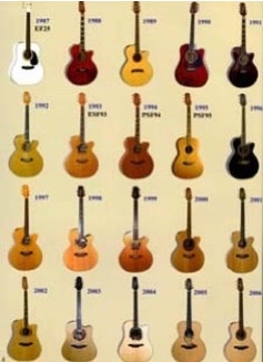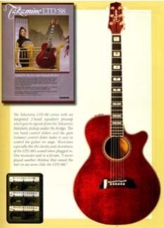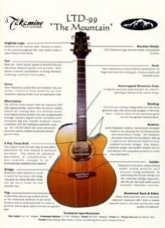 The first chapter "The Takamine Way" traces the company's roots from its very beginning in 1962 near the foot of Mount Takamine in the town of Sakashita, Japan. The growth of the company is traced through the 60's and 70's with historical photos and print ads. The development of the acoustic - electric guitars is also well documented along with Takamine's rise as a prominent force in the global guitar market and guitar of choice for many professional touring musicians. But the heart of the subject matter of this fine book is the detailed chronicle of each and every Limited Edition model. For each LTD model the specifications and design drawings are shown in detail along with exquisite color photographs and ad reprints. The motivation and design objectives are well discussed. The subject never strays far from the title "The Art Of Wood And Tone" and examines in great detail the fine craftsmanship and meticulous attention that goes into each and every LTD model. A separate chapter is dedicated to each years guitar.