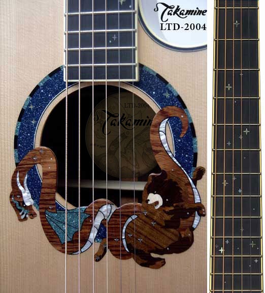 Shown below is the LTD 2004, a cutaway Dreadnaught of solid Spruce top and Rosewood back and sides. The rosette features the Draco Great Bear and a Swirling Stars inlaid on the fretboard.