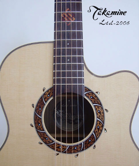 Shown below is the LTD 2006, an OM cutaway body of solid Spruce top and Sepele back and sides. The rosette features inlaid Earth Seasons and an Eternal Knot inlaid as the 12th fret marker.